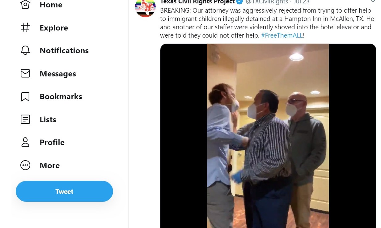 “Nuestro abogado fue agresivamente rechazado por tratar de ofrecer ayuda a los niños migrantes ilegalmente detenidos en el Hampton Inn en McAllen”, indicó la organización. “Él y otro miembro de nuestro equipo fueron violentamente empujados al elevador del hotel”.