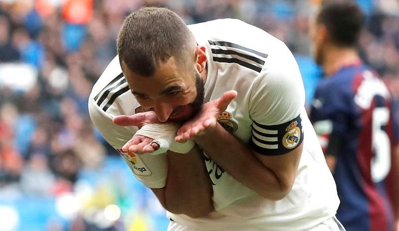 Karim Benzema celebra su segundo gol en el triunfo 2-1 del Real Madrid sobre el Eibar Crédito: EFE