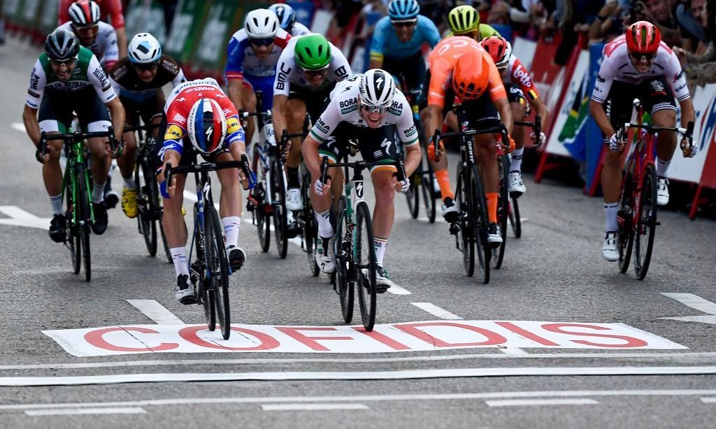 Fabio Jakobsen (blanco) cruzando la meta en el Tour de España. Crédito: OSCAR DEL POZO | AFP / Getty Images