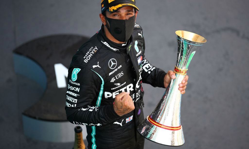 Lewis Hamilton con el trofeo del Gran Premio de España. Crédito: BRYN LENNON/POOL | AFP / Getty Images