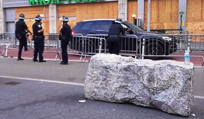 La turba ruidosa marchó por el vecindario el sábado por la noche, y la policía recibió por primera vez una llamada al 911 a las 8:20 p.m. sobre vandalismo contra la “Apple Store” en Bedford Avenue, donde encontraron ventanas rotas y las letras “FTP”, que típicamente significan “F-k la policía” en este contexto, pintadas con aerosol en la pared.