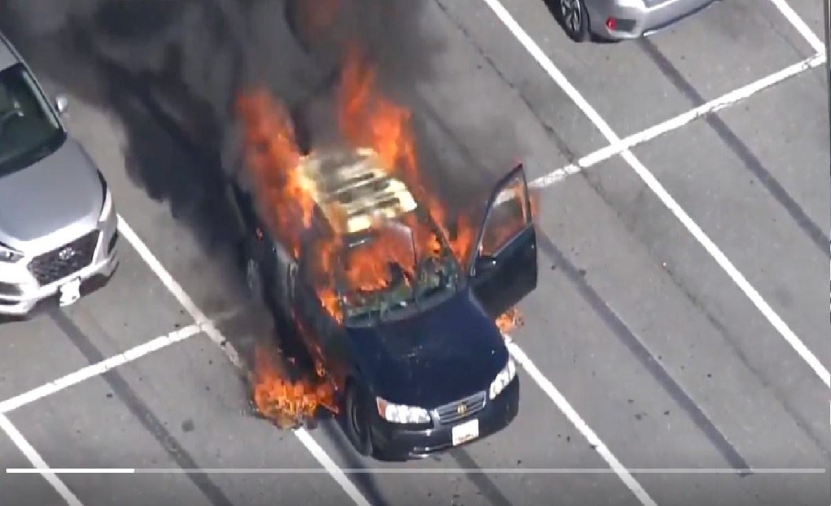En un aterrador video tomado desde un helicóptero de noticias muestra el vehículo ardiendo en un aparcamiento de Maryland mientras los bomberos se apresuran a apagar las llamas.