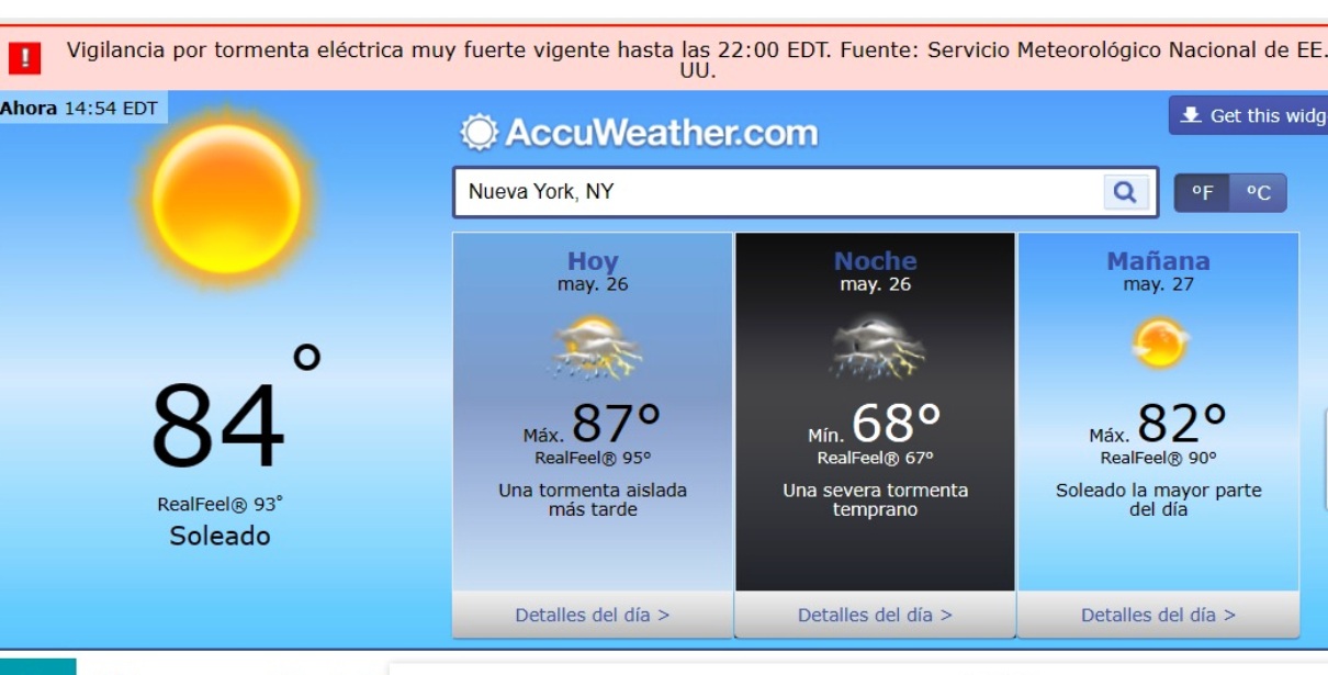 “Un tornado podría surgir en NYC a medida que un frente de tormenta azota la ciudad (…) La ciudad se encuentra bajo una perspectiva climática peligrosa el miércoles, ya que un frente frío que se acerca conlleva la posibilidad de tormentas eléctricas severas que comiencen por la tarde y hasta la noche, según el Servicio Meteorológico Nacional (NWS). El granizo e incluso un tornado aislado también es una posibilidad para NYC y los puntos al norte y oeste”, resumió Patch.com.