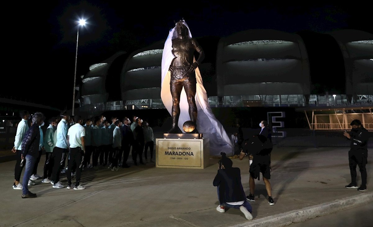 La estatua de bronce, de Diego Armando Maradona, está antes de entrar al estadio Único Madre de Ciudades en Santiago del Estero