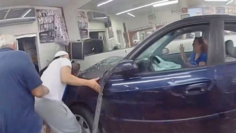 Milagrosamente la trepidante escena, captada por videos de seguridad y cámaras corporales, no terminó en tragedia gracias a la rápida acción de dos policías que por casualidad estaban desayunando cerca.