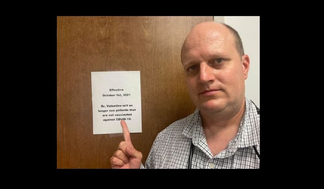 “Efectivo el 1 de octubre de 2021. El doctor Valentine ya no verá a pacientes que no estén vacunados contra COVID-19”, se lee en un anuncio pegado en una puerta que se ha difundido a través de Facebook.