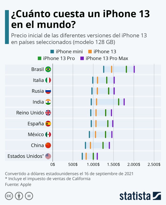 Y aunque los productos son los mismos en todo el mundo, no quiere decir que su precio sea igual en todos los países. El sitio Statista publicó los diferentes precios en los que se encuentran las versiones del iPhone 13 en diferentes partes del planeta.