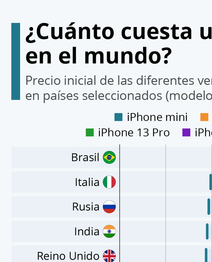 Y aunque los productos son los mismos en todo el mundo, no quiere decir que su precio sea igual en todos los países. El sitio Statista publicó los diferentes precios en los que se encuentran las versiones del iPhone 13 en diferentes partes del planeta.