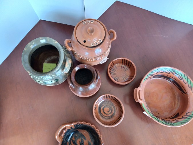 - Vasijas, platos u ollas hechas a mano con apariencia tosca o forma irregular, o vajilla de cerámicas antigua.