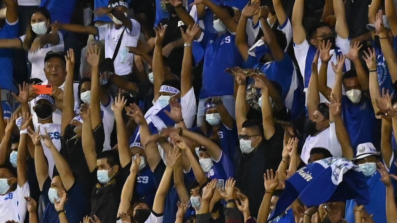 Fanáticos de El Salvador animan a su equipo durante el partido de fútbol clasificatorio de la Concacaf para la Copa Mundial de la FIFA Qatar 2020 contra México. Crédito: MARVIN RECINOS | AFP / Getty Images