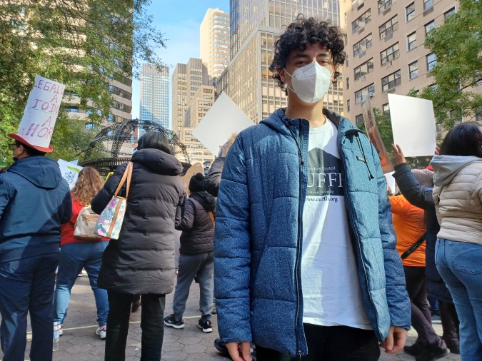 El estudiante salvadoreño Denis Ibarra, de 22 años, en medio de la manifestación que rodeó el rascacielos en donde se encuentra el despacho del senador Schumer en Manhattan, relató que llegó a este país con su familia “cruzando ríos y montañas” cuando tenía 11 años.
