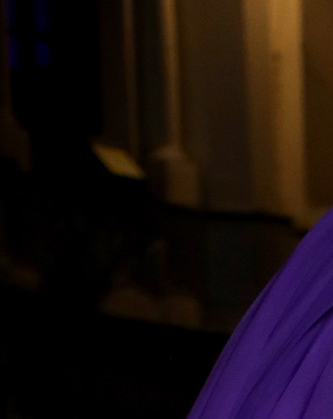 Asimismo, lo que más resalta del atuendo es la notable capa color lila alrededor de la cantante, la cual combinó muy bien con su vestido morado e hizo lucir más su look con unas medias transparentes color negras y unas botas de cuero con plataforma. En cuanto a los accesorios, Lady Gaga optó por una gargantilla de oro y unos aretes lujosos color plateados.