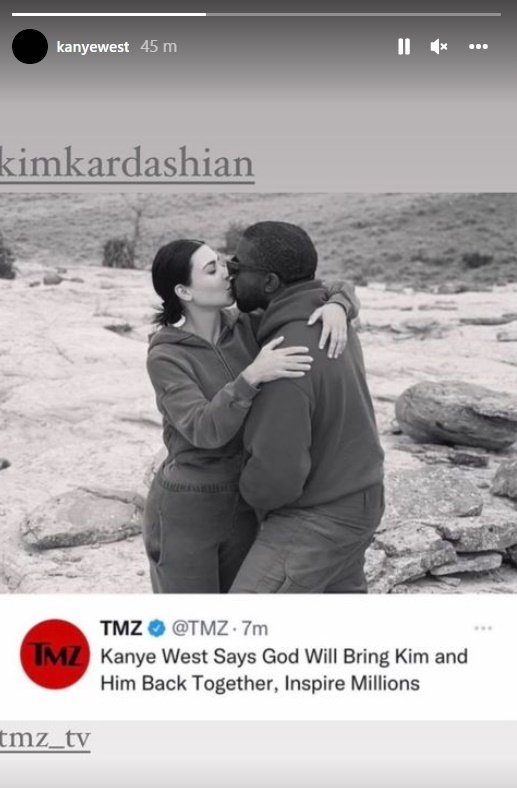 Para acompañar la postal, el rapero incluyó un titular de TMZ que exponía: “Kanye West dice que Dios juntará nuevamente a él y a Kim e inspirará a millones”, lo cual desató todo tipo de reacciones entre sus fans y ahora se preguntan si Kim le está dando una segunda oportunidad.