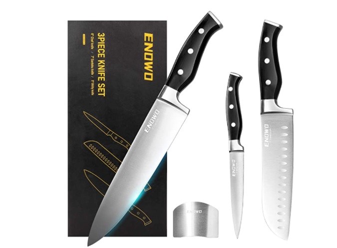 Si en tu casa ya es necesario cambiar cuchillos, esta es una buena oportunidad, ya que puedes encontrar en Amazon este juego de cuchillos de cocina ultra afilados para chef de la marca Enowo, 3 piezas, cuchillo de acero inoxidable alemán de primera calidad con hoyuelo revestido con protector de dedos, mango ergonómico y caja de regalo. Los puedes comprar por $31.99 dólares, su precio de lista es de $39.99 dólares, lo que representa un descuento del 22%.