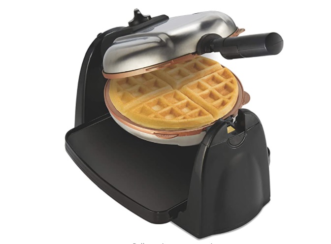 Para ese rico desayuno, puedes comprar una waflera Hamilton Beach 26031, con platos antiadherentes extraíbles, una sola tapa, rejillas de cerámica, color negro, que tiene un precio de $39.99 dólares. Su precio normal es de $59.99 dólares