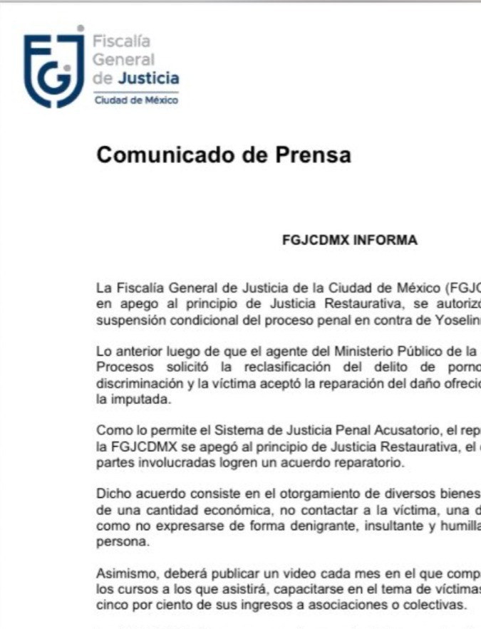Cabe señalar que Yoseline pudo recuperar su libertad gracias a que su caso se reclasificó como discriminación, delito que no amerita prisión, entonces se autorizó por tres años la suspensión condicional del proceso penal en su contra.