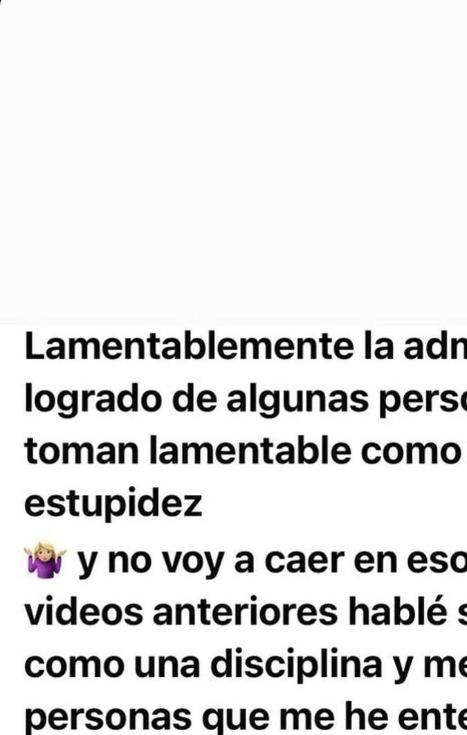 “Lamentable la admiración por lo logrado de algunas personas, otras lo toman lamentablemente como chisme y estupidez y no voy a caer en eso y punto. En videos anteriores hablé sobre la bariátrica como una disciplina y mencioné a personas que lo han logrado así”, explicó.