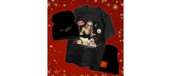El gorro viene con el autógrafo de la estrella, mientras que la camiseta incluye una foto retro de Mariah disfrutando de su pedido de McDonald’s: una hamburguesa con queso con pepinillos adicionales.