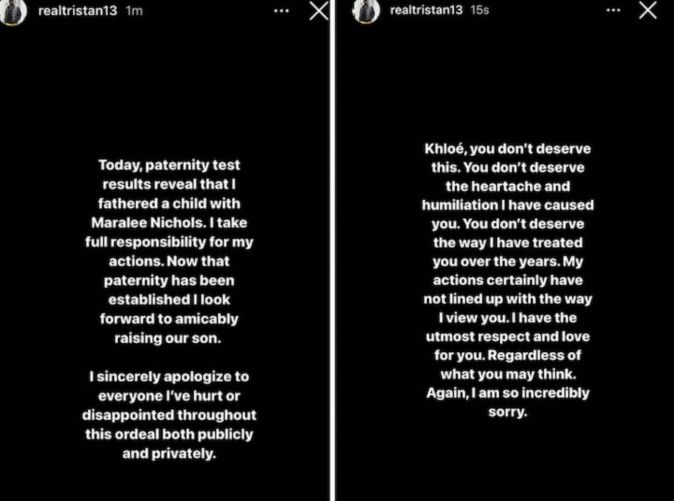 Tristan Thompson sí es padre del hijo de Maralee Nichols y se disculpa públicamente con Khloé Kardashian