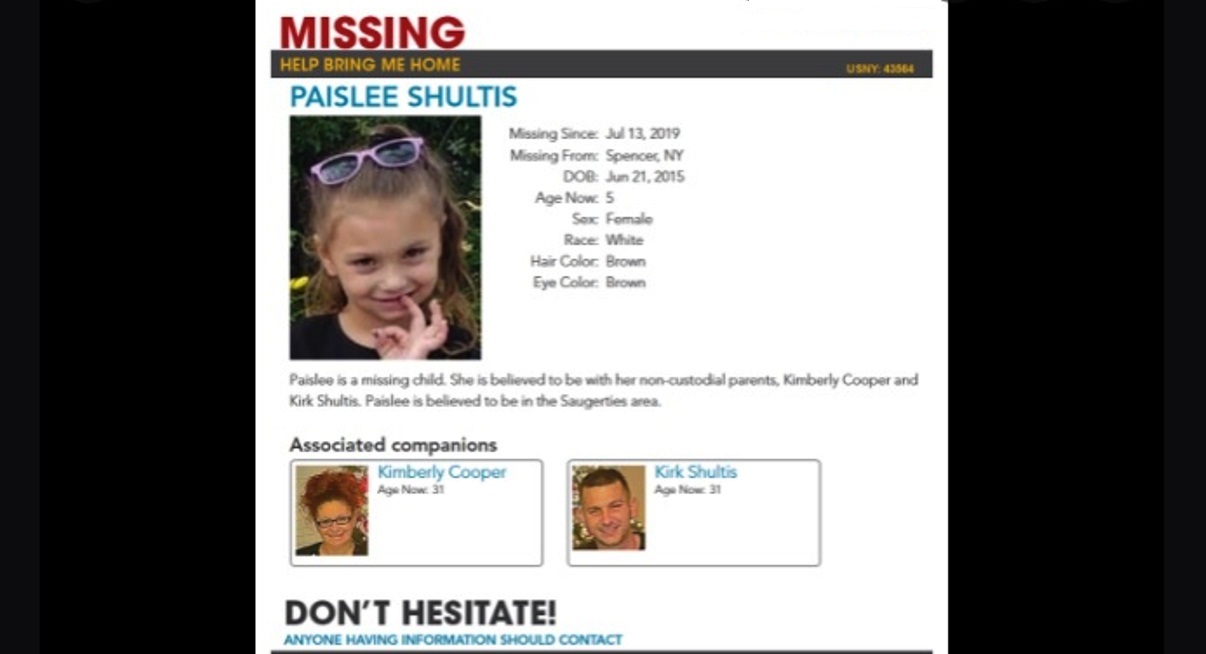 Paislee Shultis, una niña que fue reportada como desaparecida de su casa en el condado Tompkins (NY) en 2019 cuando tenía 4 años, fue localizada y aparentemente estuvo retenida todo este tiempo en una habitación secreta a 150 millas, en un hogar en Saugerties, condado Ulster (NY).