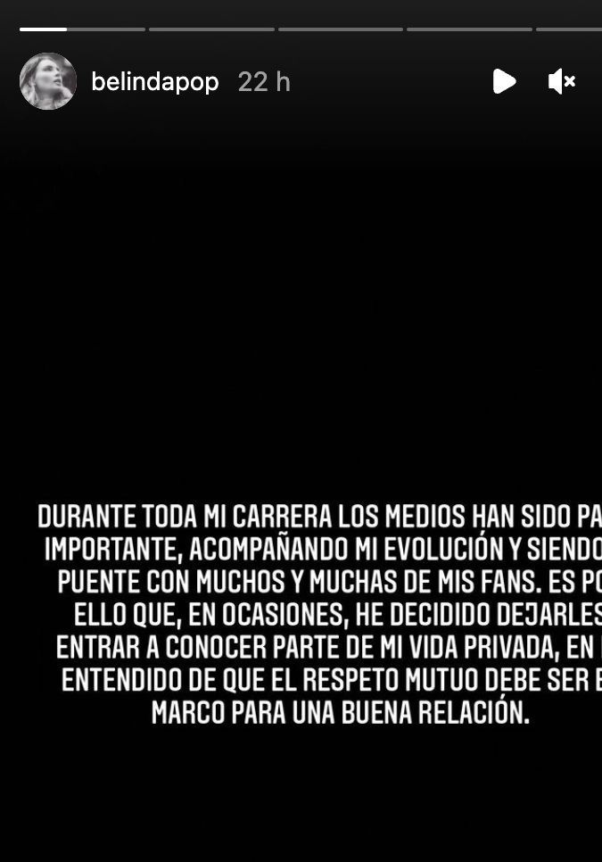 Belinda, además, lamentó la violencia de género de la que ha sido objeto en los últimos días, y adelantó que tomará todas las medidas necesarias, incluso legales, en contra de aquellos medios de comunicación y personas públicas que la han difamado y violentado.