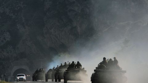 Se reportó que el convoy contenía cientos de vehículos blindados, tanques, artillería y vehículos de apoyo logístico. Crédito: Natalia Kolesnikova | AFP / Getty Images