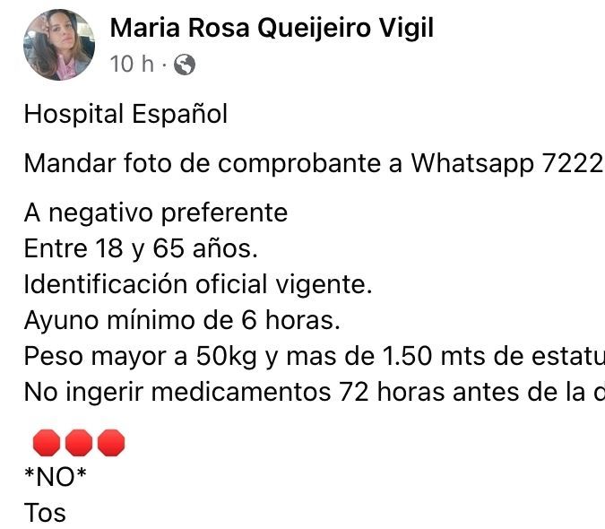 “Hospital Español. Mandar foto de comprobante a Whatsapp 7222615685. A negativo preferente. Entre 18 y 65 años. Identificación oficial vigente. Ayuno mínimo de 6 horas. Peso mayor a 50 kg y más de 1.50 mts de estatura. No ingerir medicamentos 72 horas antes de la donación”, indicó en su página de Facebook y en stories de Instagram.