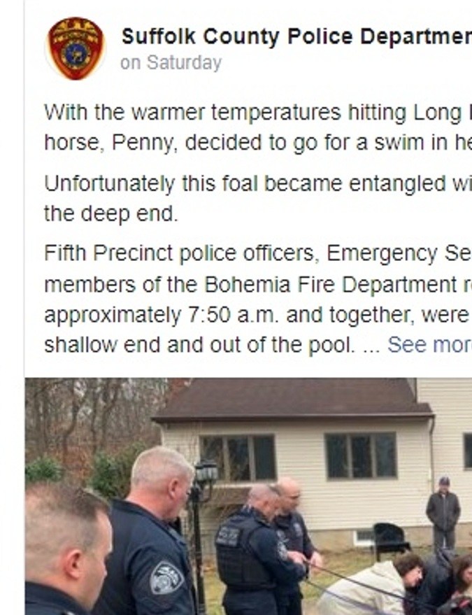 Agentes del Departamento de Bomberos de Bohemia y oficiales de la Sección de Servicios de Emergencia, lograron liberar a la yegua y sacarla por la parte menos profunda de la piscina, que por estar llena de agua amortiguó la caída, evitando que la equina resultase herida. Después del gran rescate, los socorristas sonrientes posaron para una foto con Penny frente a su establo.