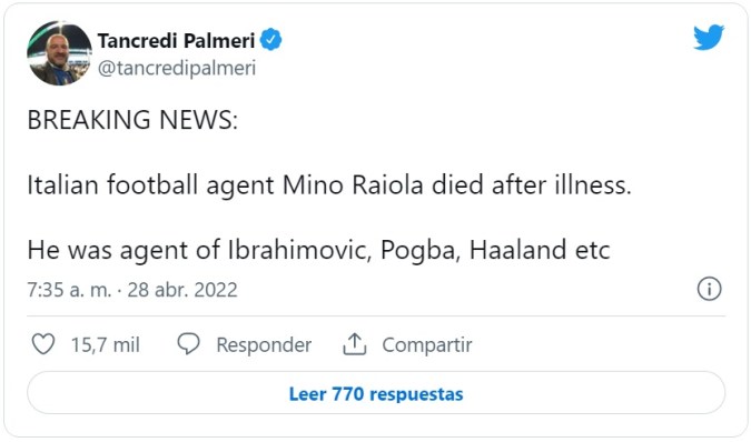 “El agente de fútbol de Italia, Mino Raiola, murió después de una enfermedad. Fue agente de Ibrahimovic, Pogba, Haaland, etc.”, escribió el comunicador.
