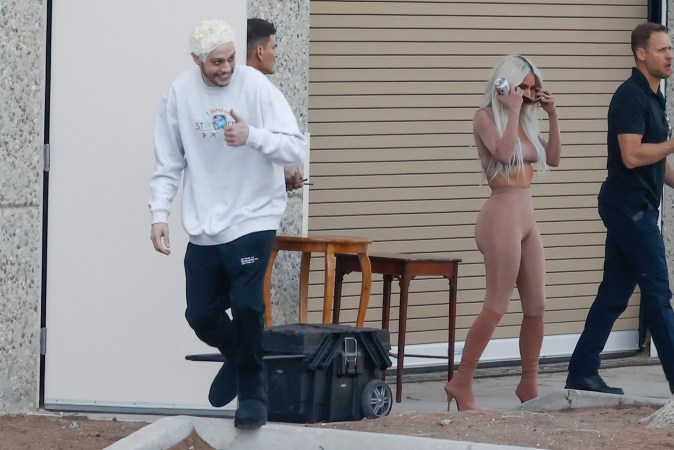 Se cree que Pete y Kim estaban grabando algún tipo de especial o posando para una nueva campaña de la marca Skims, ya que Kim Kardashian aparece en las fotos de paparazzi luciendo un atuendo en nude entallado al cuerpo, con botines a juego.
