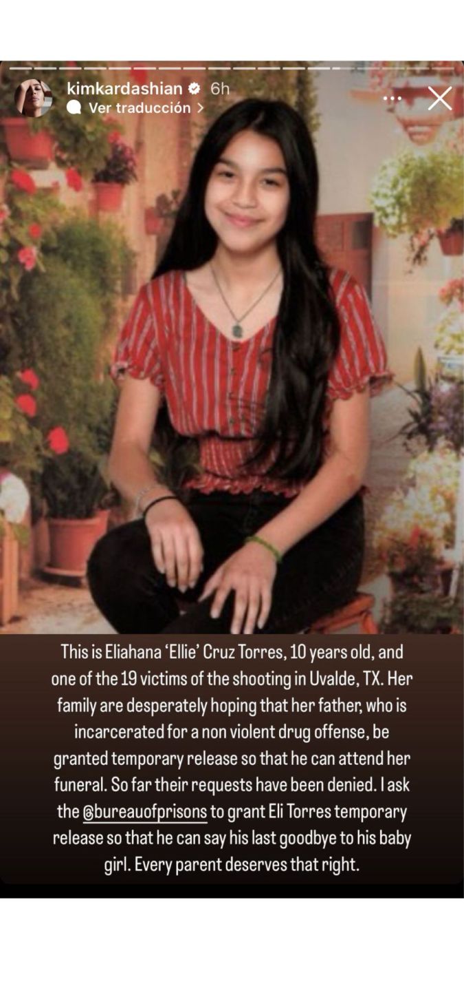 “Ella es Eliahana ‘Ellie’ Cruz Torres, de 10 años, y una de las 19 víctimas del tiroteo en Uvalde, TX. Su familia espera desesperadamente que a su padre, quien está encarcelado, se le otorgue un permiso temporal de liberación para que él pueda asistir a su funeral“, escribió en Instagram.