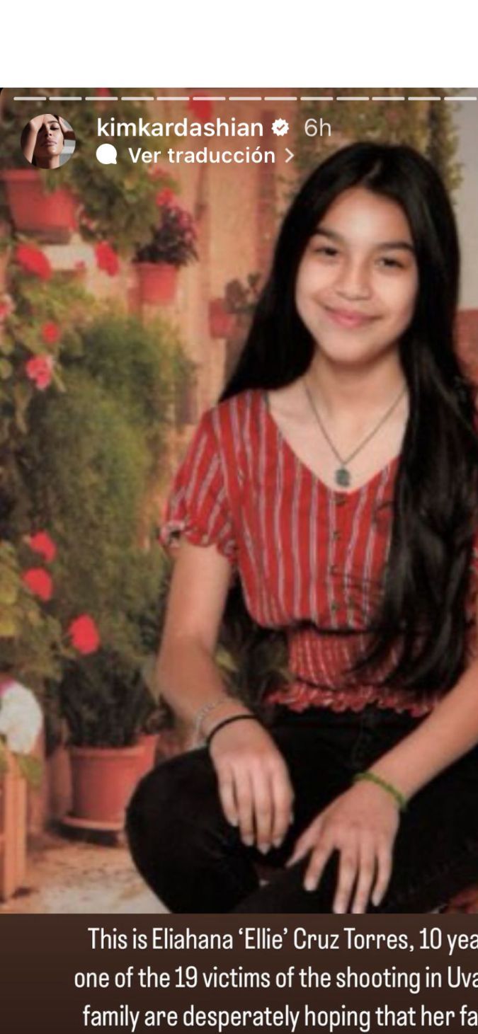 “Ella es Eliahana ‘Ellie’ Cruz Torres, de 10 años, y una de las 19 víctimas del tiroteo en Uvalde, TX. Su familia espera desesperadamente que a su padre, quien está encarcelado, se le otorgue un permiso temporal de liberación para que él pueda asistir a su funeral“, escribió en Instagram.