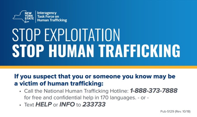 Para mayor información sobre tráfico humano en Nueva York visite: New York’s Interagency Taskforce Against Human Trafficking.