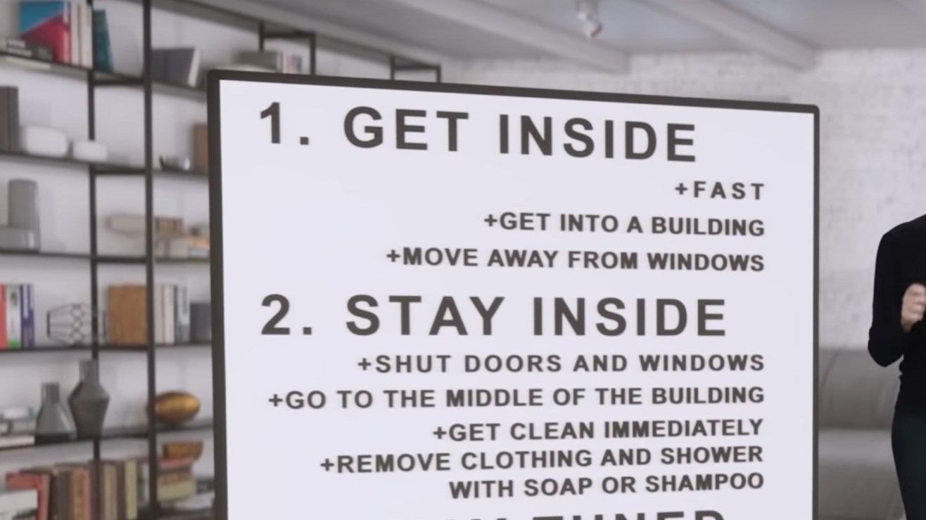 A esa primera recomendación le sigue: “Permanezca adentro. Cierre puertas y ventanas. Colóquese en el centro del edificio. Límpiese de inmediato. Quítese la ropa y báñese con jabón o shampoo”.