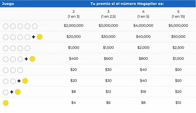 Esta combinación da como resultado las siguientes probabilidades para cada uno de los números de Megaplier y sus premios asociados: