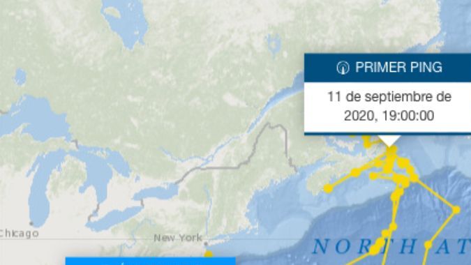 Así luce el mapa de rastreo de tiburones; la imagen señala la ubicación exacta de "Breton". Crédito: Ocearch Shark Tracker | Cortesía