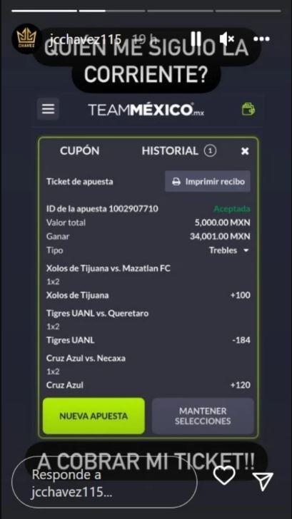 Según una publicación que realizó a través de su cuenta de Instagram, Chávez mostró una combinación de equipos de la Liga MX en los cuales apostó 5,000 pesos mexicanos ($244.4 dólares) y terminó multiplicando en más de cinco veces el monto invertido.
