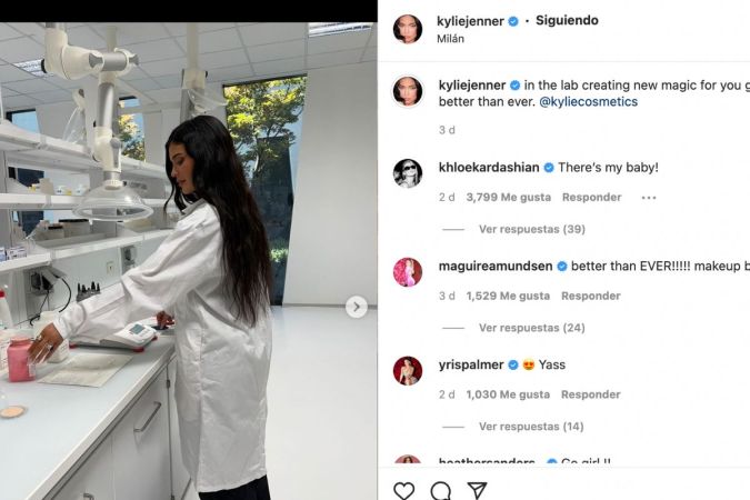 Esta semana Kylie Jenner se propuso demostrar que está completamente involucrada en la creación de los productos de su marca de cosméticos compartiendo una fotografía suya con una bata blanca mientras “creaba nueva magia” en una de sus instalaciones en Milán, Italia.