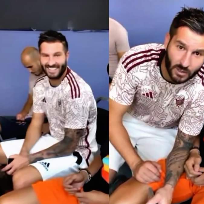 Gignac aparece en el vestuario de Tigres UANL junto a Igor Lichnovsky y Guido Pizarro bromeando con la camiseta. Y es que no es la primera vez que lo hace, ya en Rusia 2018 el francés lució la casaca verde titular de El Tri.
