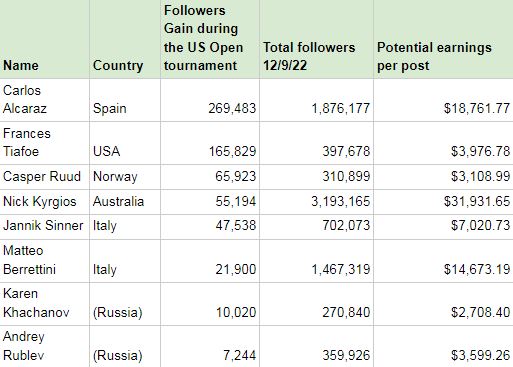 Mirando a los finalistas masculinos individuales, el español Carlos Alcaraz ganó la mayor cantidad de seguidores entre el 29 de agosto y el 12 de septiembre, con 269,483 para alcanzar un total de 1.87 millones, ahora podrá ganar aproximadamente $19,000 dólares por publicación de Instagram. El ahora número 1 del mundo, también obtuvo la mayor cantidad de seguidores cuando se cuentan juntos hombres y mujeres.