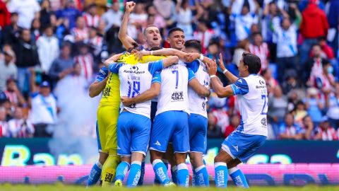 Jugadores de Puebla celebran luego de ganar la tanda de penales ante Chivas de Guadalajara. Crédito: Agustín Cuevas | Getty Images