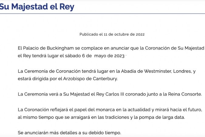 El Palacio de Buckingham ha revelado la fecha exacta de la ceremonia de coronación del rey Carlos III, luego de que se cumpliera un mes de la muerte de la reina Isabel II a los 96 años.