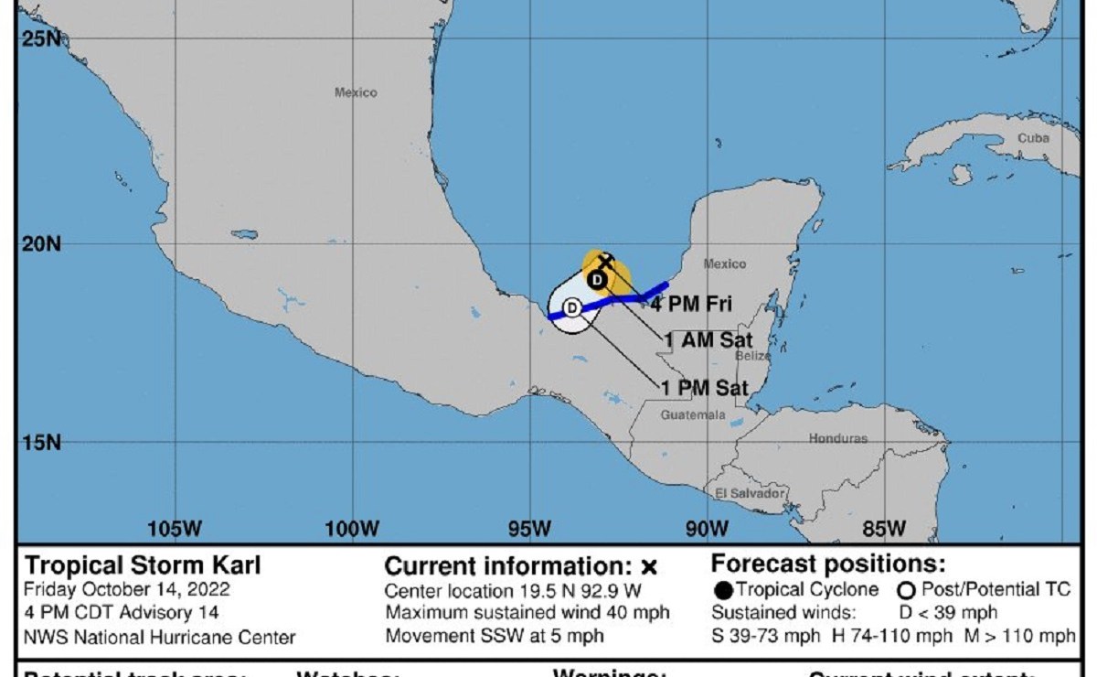 La Comisión Nacional del Agua (Conagua) de México, que opera el Servicio Meteorológico Nacional (SMN), previó que Karl toque tierra mexicana entre los municipios de Centla y Paraíso, en el estado de Tabasco, esta noche
