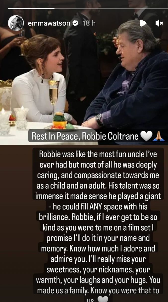 “Robbie, si alguna vez llego a ser tan amable como tú fuiste conmigo en un set de filmación, te prometo que lo haré en tu nombre y en tu memoria. Sabes cuánto te adoro y te admiro. Extrañaré mucho tu dulzura, tus apodos, tu calidez, tus risas y tus abrazos. Nos hiciste una familia. Sé que fuiste eso para nosotros”, y concluyó: “No habrá mejor Hagrid. Hiciste que fuera un placer ser Hermione”.