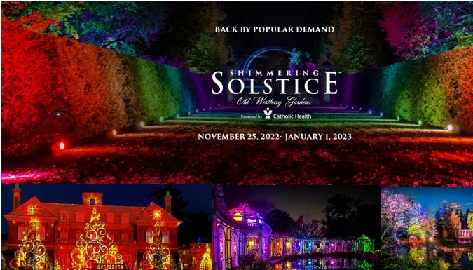 Shimmering Solstice en Old Westbury Gardens, una experiencia inolvidable de luces, imágenes y sonidos navideños, comienza su temporada este viernes 25 de noviembre. Prepárese para dejarse encantar por las exhibiciones de luces mágicas y las bandas sonoras de temporada que se encuentran a lo largo de los hermosos senderos de Old Westbury Gardens, que lo llevarán a través del mundialmente famoso Walled Garden, Rose Garden, South Lawn y Allée, solo por nombrar algunos. Diseñado para Old Westbury Gardens por Lightswitch (un colectivo de diseñadores de iluminación, medios y visuales reconocidos internacionalmente), este año exhibirá un espectáculo final aún más sorprendente en la cara sur de Westbury House. Los jardines están ubicados en el 71 Old Westbury Rd, Old Westbury, NY 11568. Para horarios y boletos, visite: https://shimmeringsolstice.com