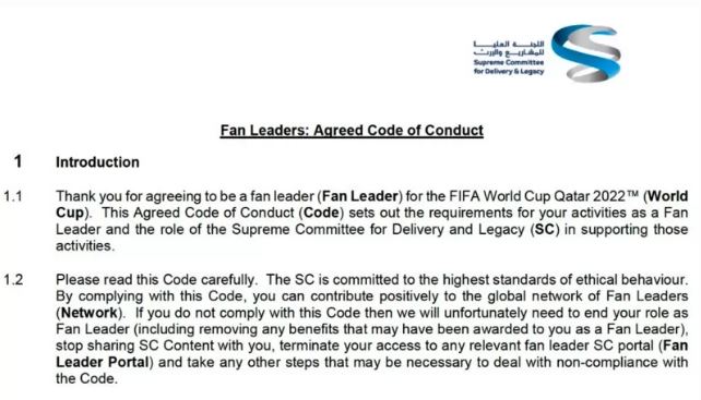 Si bien en el acuerdo se les dice a los fanáticos que no se espera que sean “portavoces de Qatar”, se les pide que no “menosprecien al Comité Supremo de Qatar” o a la “Copa del Mundo Qatar 2022”.