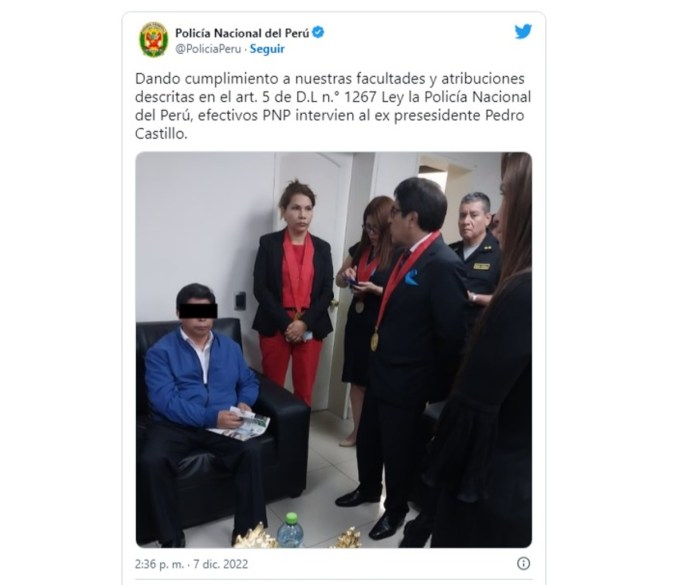 La Policía Nacional del Perú había anunciado en Twitter con una foto la detención del “ex presidente Pedro Castillo”, pero luego la publicación fue borrada.