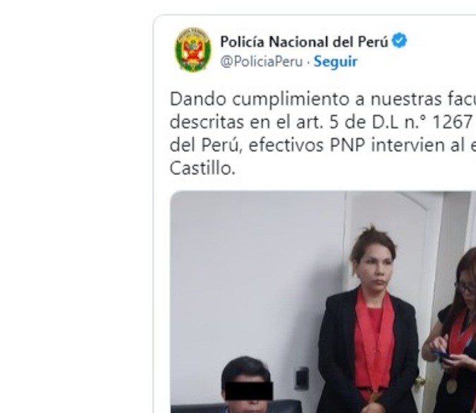 La Policía Nacional del Perú había anunciado en Twitter con una foto la detención del “ex presidente Pedro Castillo”, pero luego la publicación fue borrada.