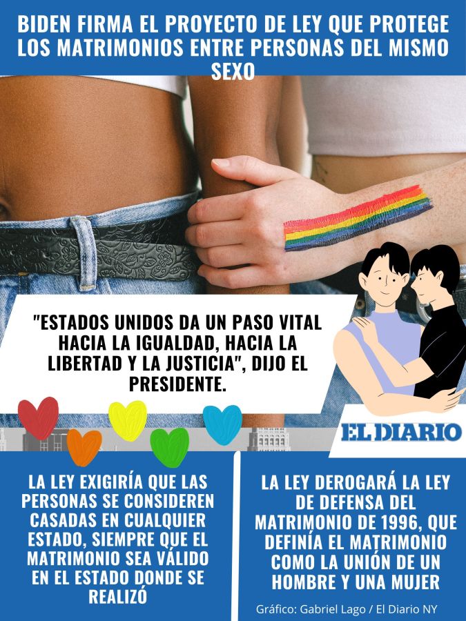 La nueva ley protegerá los matrimonios entre personas del mismo sexo si la Corte Suprema revocara la decisión histórica Obergefell v. Hodges, que en 2015 legalizó los matrimonios entre personas del mismo sexo en Estados Unidos.