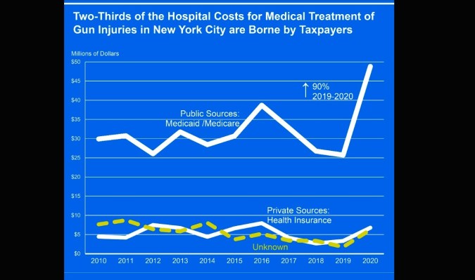 Entre 2010 y 2020 los costos hospitalarios totales resultantes de lesiones por arma de fuego en la ciudad de Nueva York ascendieron a $469 millones de dólares, según cálculos ajustados por inflación.